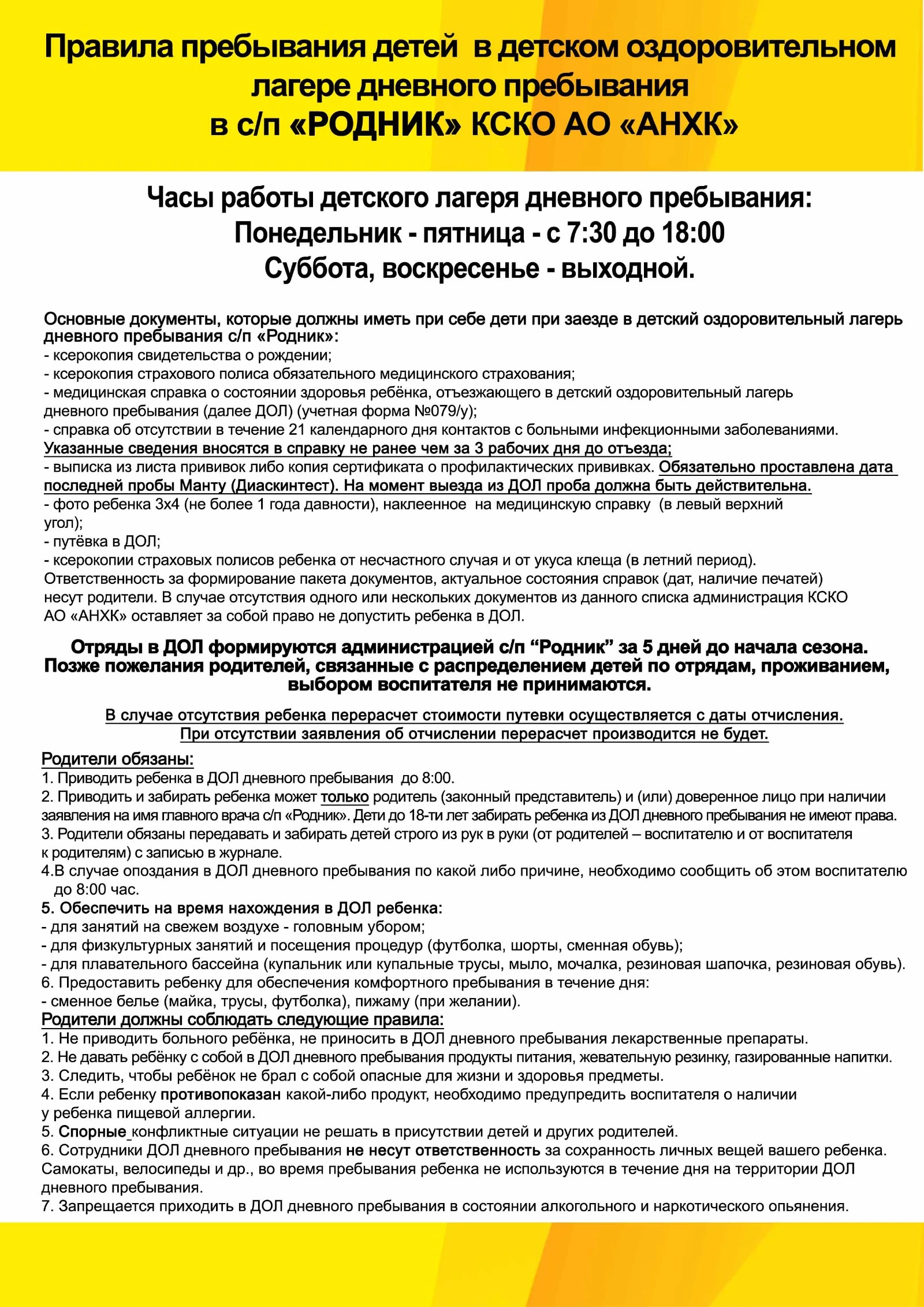 Правила пребывания детей в ДОЛ дневного пребывания с/п "Родник"