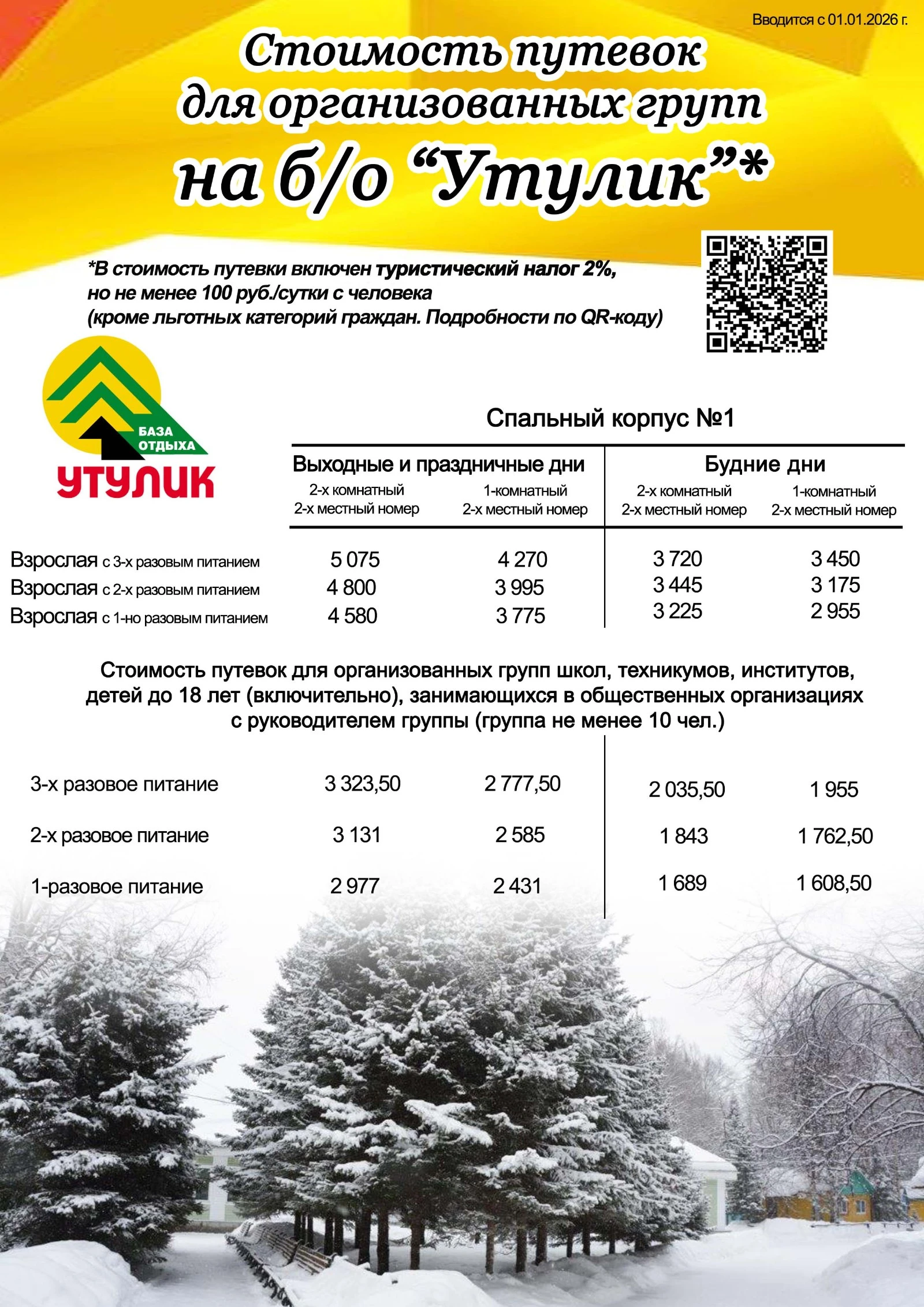 Стоимость путевок для организованных групп школьников и студентов